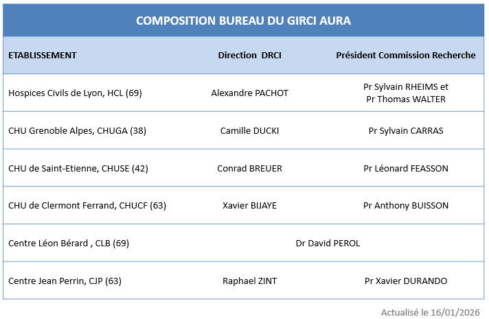 Le GIRCI AURA a la mission de soutenir la recherche clinique des établissements de santé et professionnels de santé actifs ou intéressés à le devenir dans la région. Tout établissement de santé dans le cadre de la mise en place des GHT ayant contractualisé avec le CHU de référence de leur subdivision sur la recherche sera ré adressé auprès de la DRCI de cet établissement. Toutefois, le rôle du GIRCI AURA ne doit pas entraver ou s'opposer aux conventions signées entre le CHU de référence et les établissements de santé de son GHT, ni aux GHT associés qui sont en cours de signature.